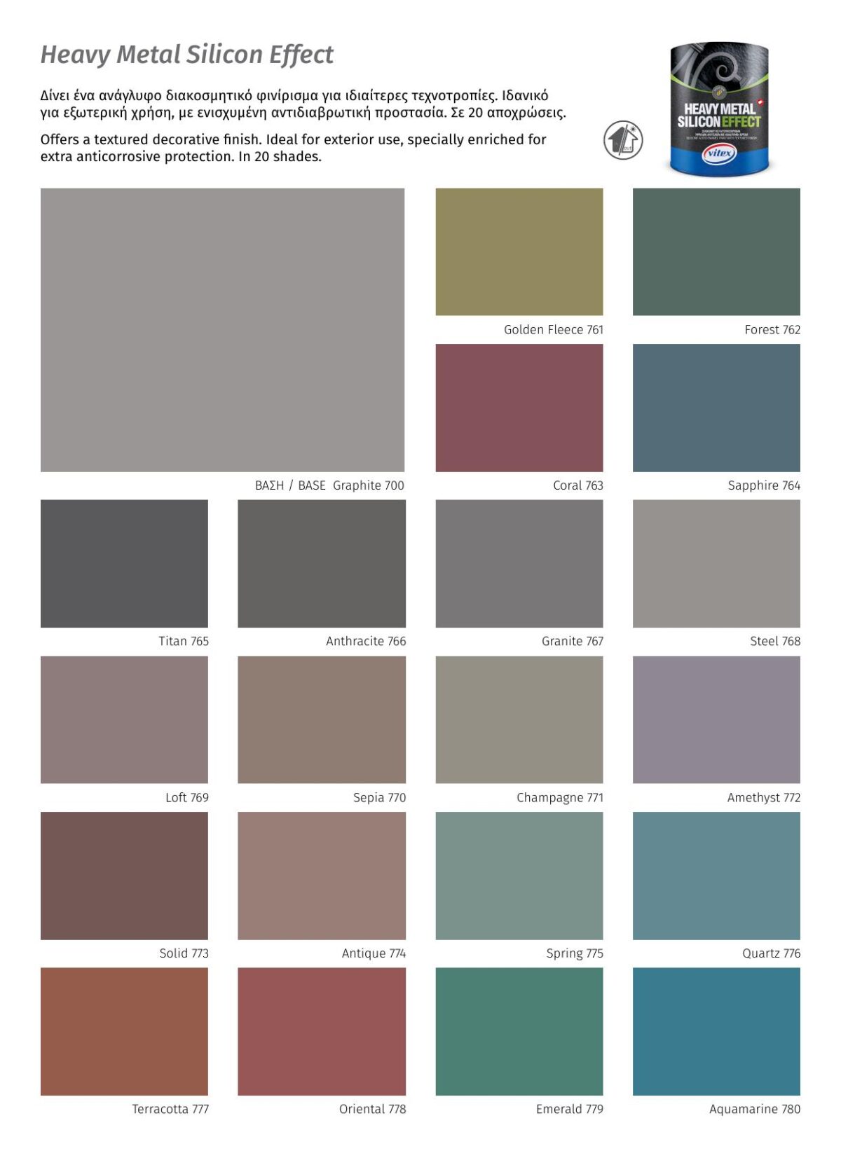 Σιλικονούχο ντουκόχρωμα διαλύτου υψηλής αντοχής με ανάγλυφη χροιά, κατάλληλο για εσωτερικές και εξωτερικές μεταλλικές επιφάνειες. Αυτός ο τύπος του Heavy Metal Silicon περιέχει υψηλό ποσοστό κόκκων οξειδίου του σιδήρου, το οποίο χαρίζει στη βαμμένη επιφάνεια ένα ιδιαίτερο διακοσμητικό φινίρισμα και ταυτόχρονα προσφέρει υψηλή αντοχή στη διάβρωση και την υπεριώδη (UV) ακτινοβολία. Μπορεί επίσης να χρησιμοποιηθεί και για τη βαφή ξύλου.